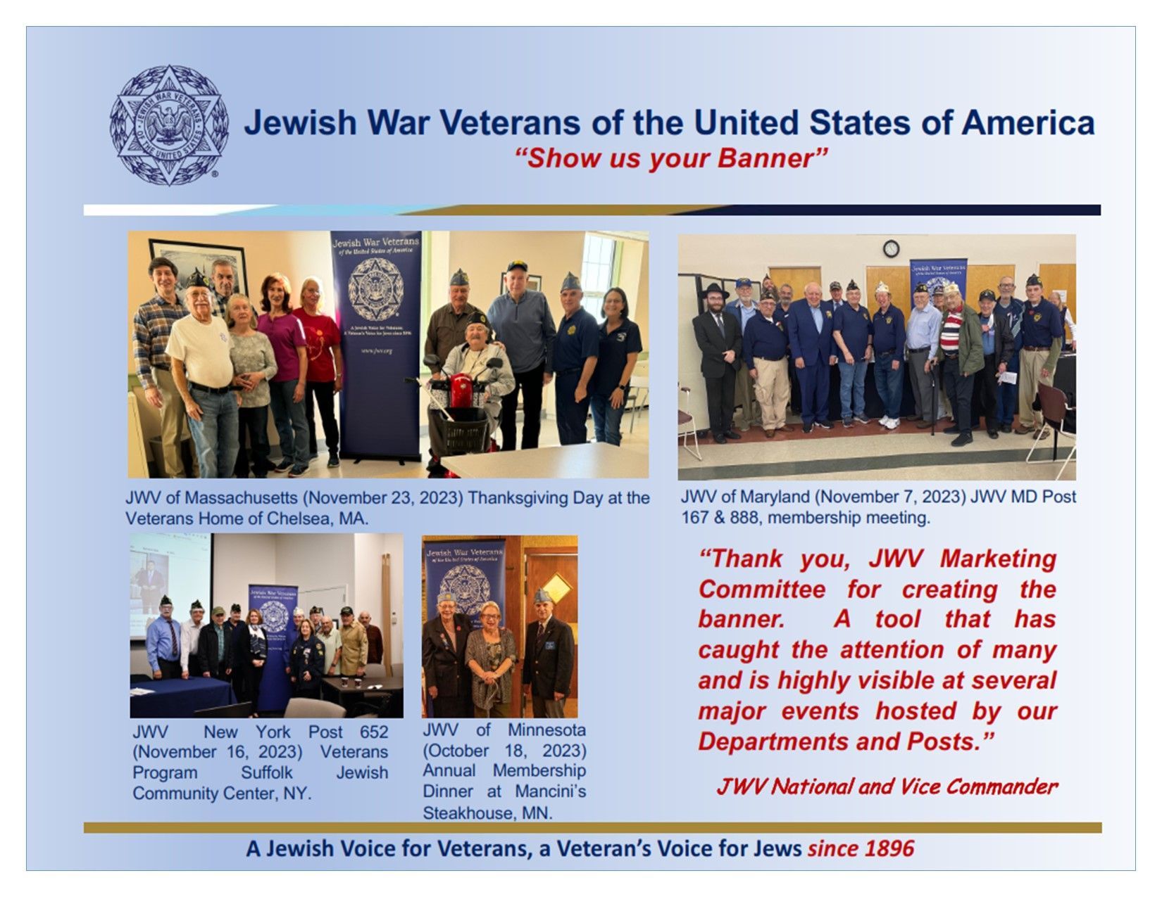 JWV National has made Post Banners available to all Posts who want them for display at meetings and events. How better to call attention to our organization and gain new members, attract donors, or advertise who we are. We will post complete information regarding purchase of the banners as soon as it is available.