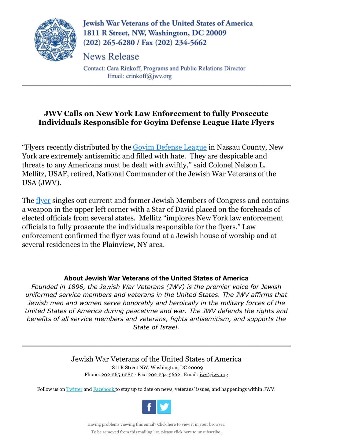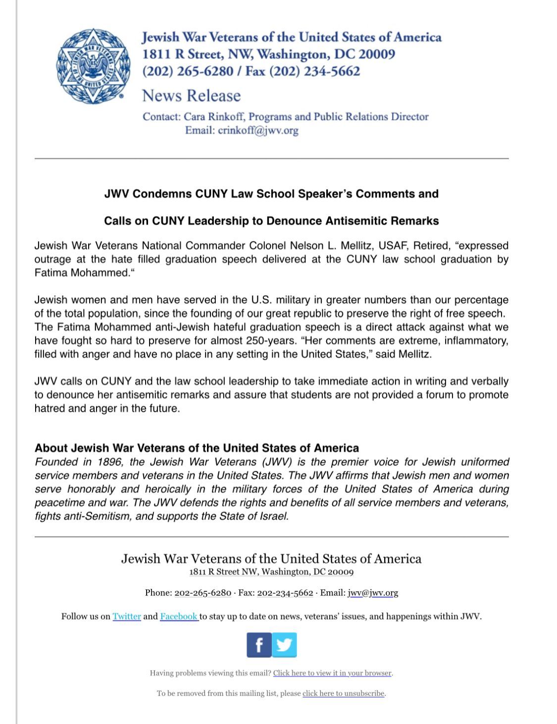 Please read the two position papers below from the National Officers of the Jewish War Veterans of the United States regarding CUNY Hate Speech and actions of the Goyim Defense League, both of which we find despicable and hateful. As an American Jewish Veteran of the U.S. Army, I urge Bill Thompson to take action immediately to remove Dean Setty for condoning and applauding such hate speech.