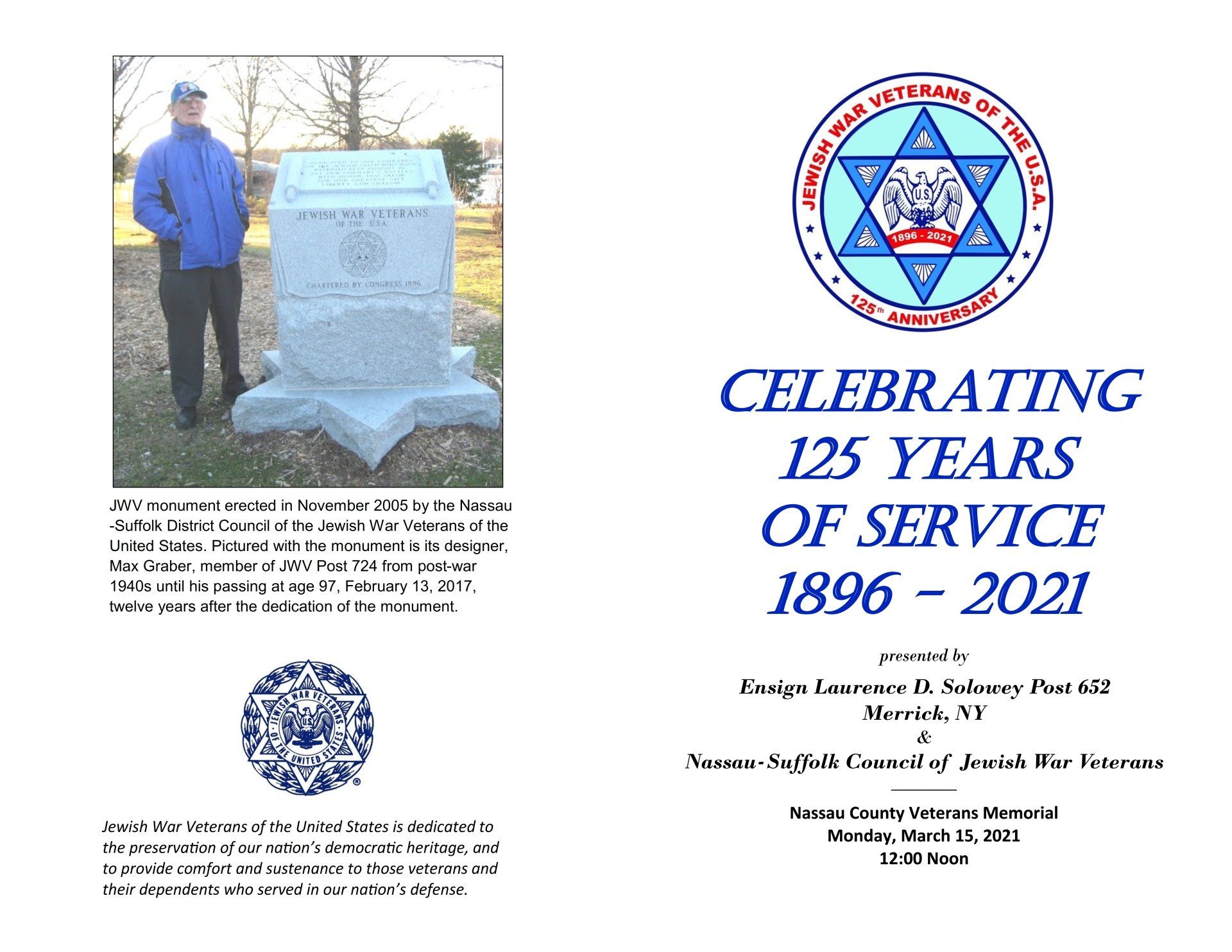 On Monday, 15 March 2021, the Ens. L D Solowey Post # 652 and JWV Nassau-Suffolk District Council proudly celebrated the event at a ceremony held at the Nassau County Veterans Memorial at Eisenhower Park, Uniondale, NY.