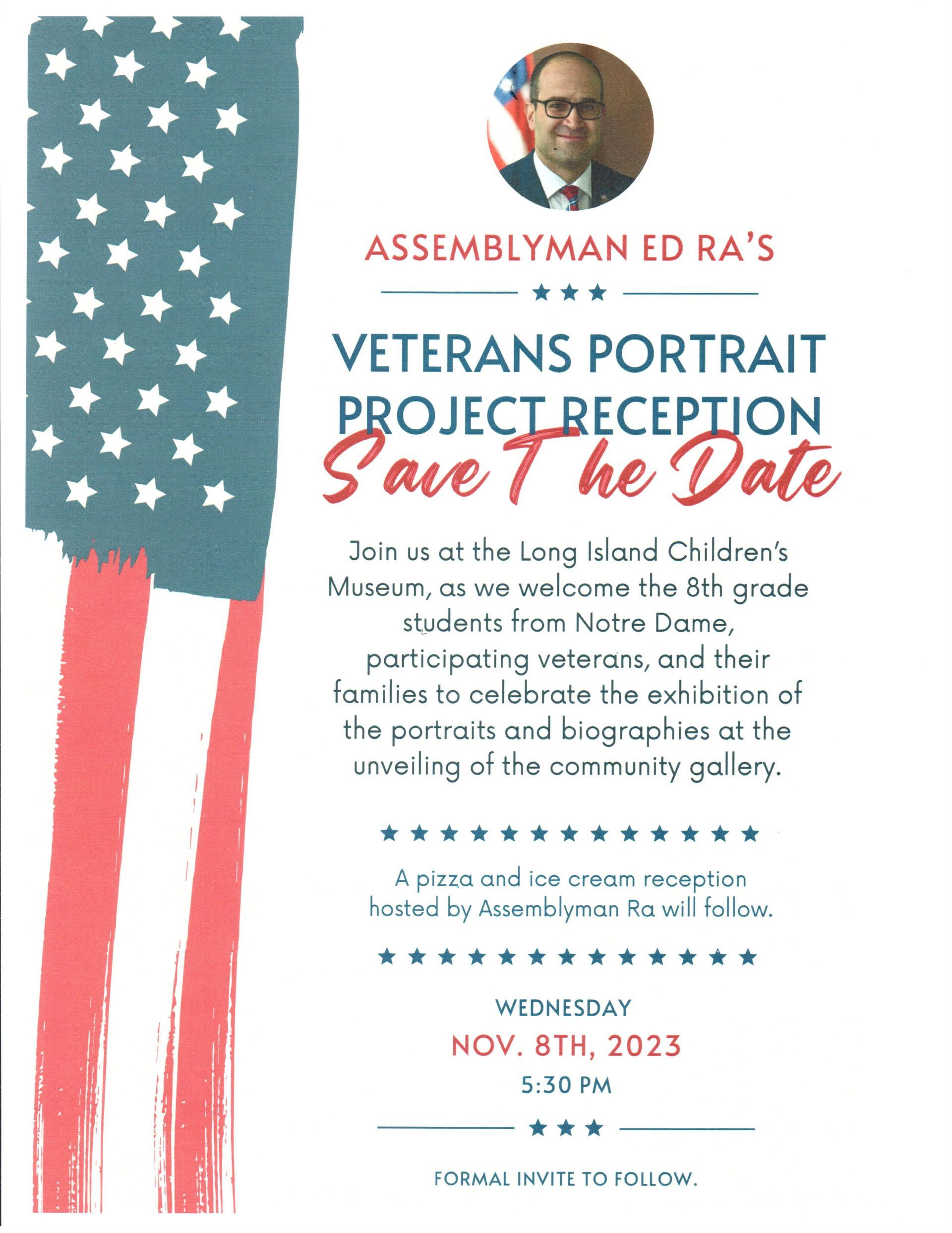 Sponsored again for the 4th year, this project in conjunction with the Notre Dame School in New Hyde Park, based on the "Portraits of Courage" book by President George W. Bush, introduces the students to veterans from all branches of service. The students interview the veterans, then draw sketches of their veterans that will be turned into paintings. In early November, all of the student work will be unveiled at a special exhibit at the Long Island Children's Museum in Uniondale, NY and will remain on display for all visitors to see. You are welcome to join us on Wednesday, November 8, 2023 at 5:30pm for the opening reception.
